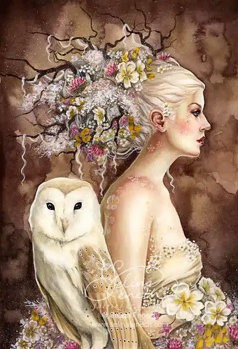 Existe muito mais nessa história do que os olhos comuns podem ver… O nome Blodeuwedd, literalmente, significa “Rosto de Flor” e representa, muitas vezes, um lírio branco. É a esperança que nasce no meio da dificuldade. Ela é a Deusa de um novo amanhecer e da primavera nos mitos galeses. Associada à visão noturna das corujas, às fadas escuras e aos mistérios do Outro Mundo.